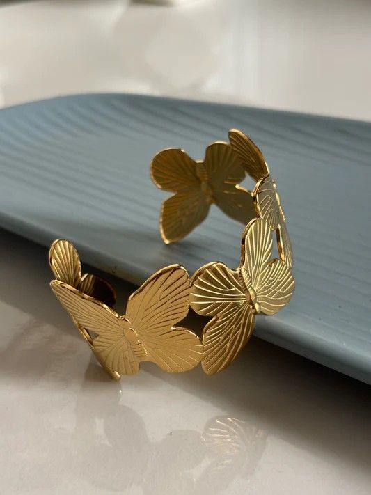 The open cuff design ensures easy wear and a comfortable fit, while the textured detailing on each butterfly adds depth and sophistication. Its eye-catching structure makes it perfect for special occasions, festive looks, or elevating everyday outfits with a touch of glamour.